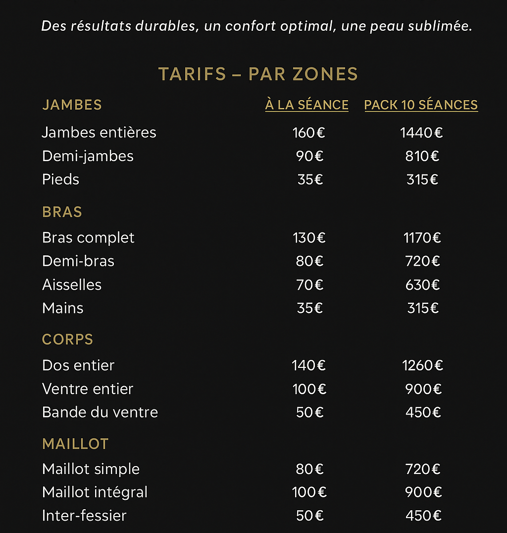 Grâce à nos soins par zone (maillot, jambes, aisselles, bras, pieds…), vous choisissez exactement ce dont vous avez besoin, en toute simplicité.